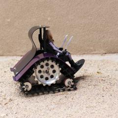 SoloKat (personal snowcat)The minimal approach to personal snow transportation. Power comes from 2-860 kv motors, and 2 25a esc's. A cooling fan is mounted between the 2 esc's. The tracks were made by cutting down Kyosho Blizzard tracks. The receiver sits under the drivers seat, and the battery goes in behind the seat. The chassis and fenders are aluminum. Driven by "Kick Ass 2 Hit Girl" |
